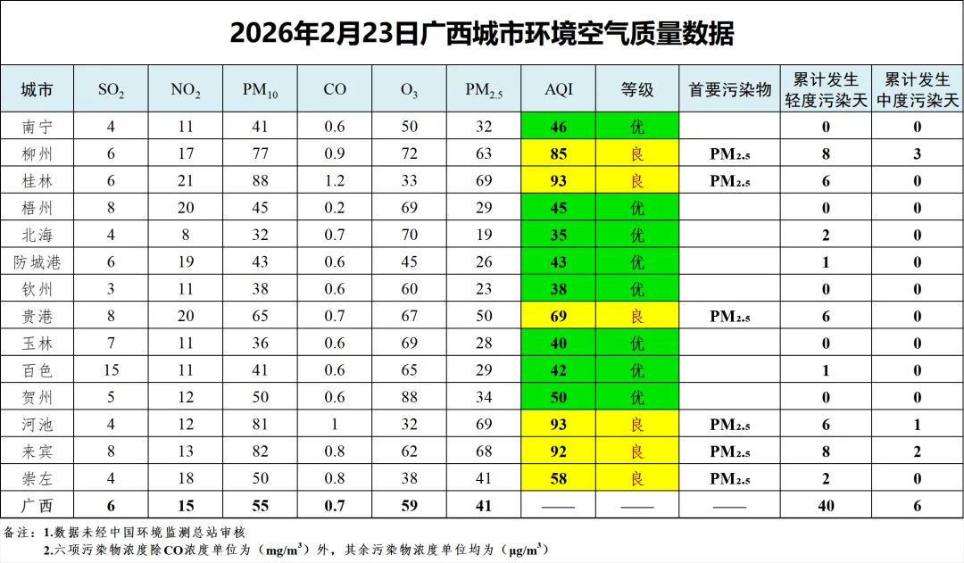 2月23日广西城市环境空气质量数据