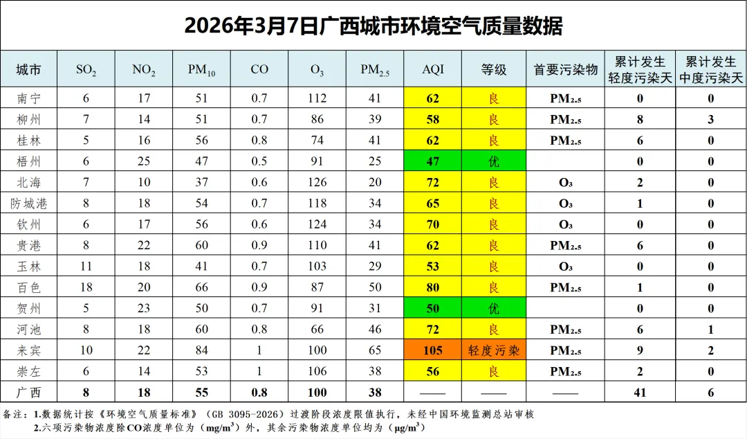 3月7日广西城市环境空气质量数据