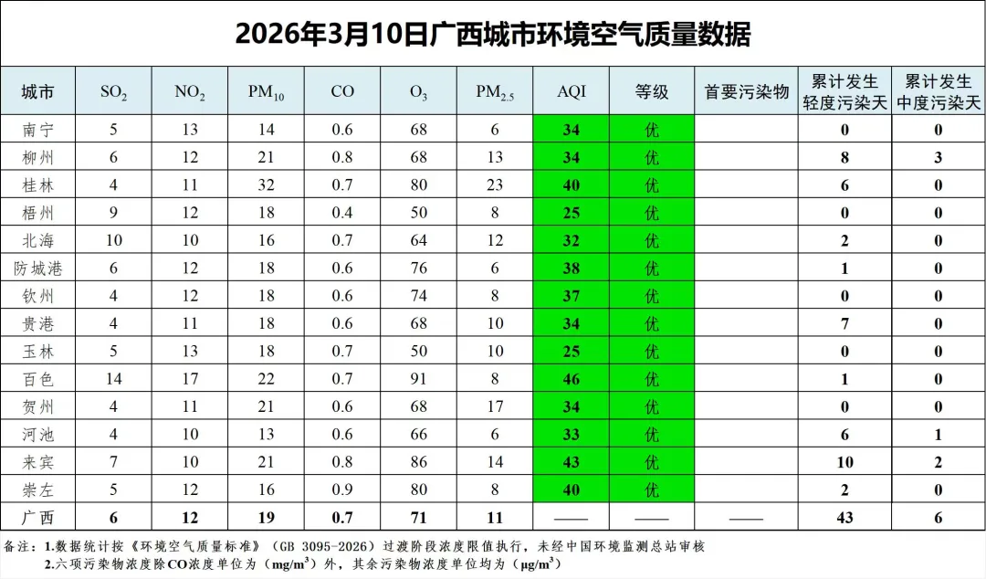 3月10日广西城市环境空气质量数据