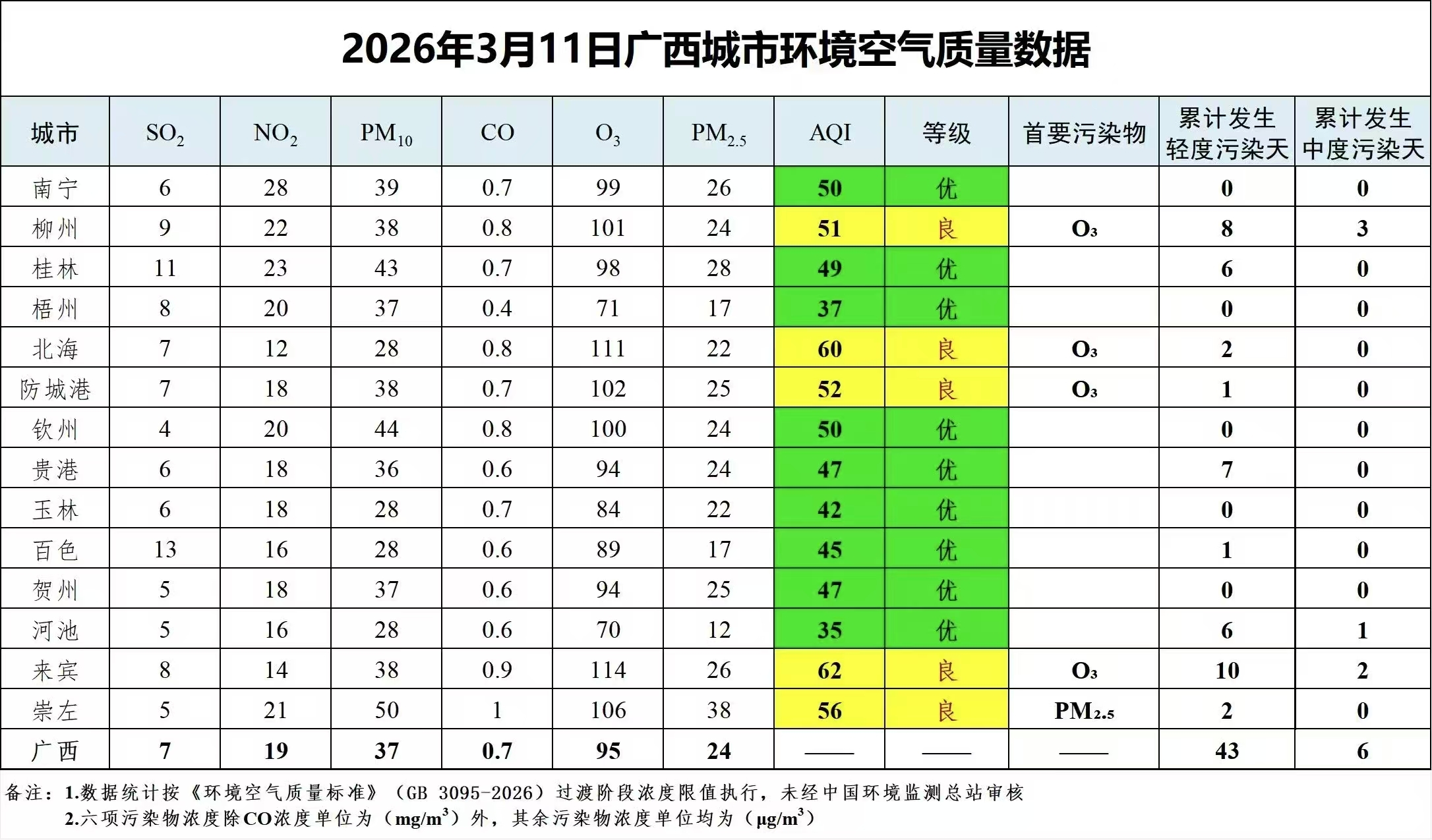 3月11日广西城市环境空气质量数据