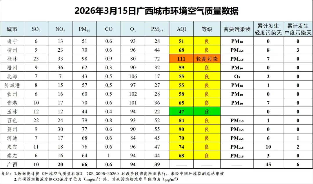 3月15日广西城市环境空气质量数据