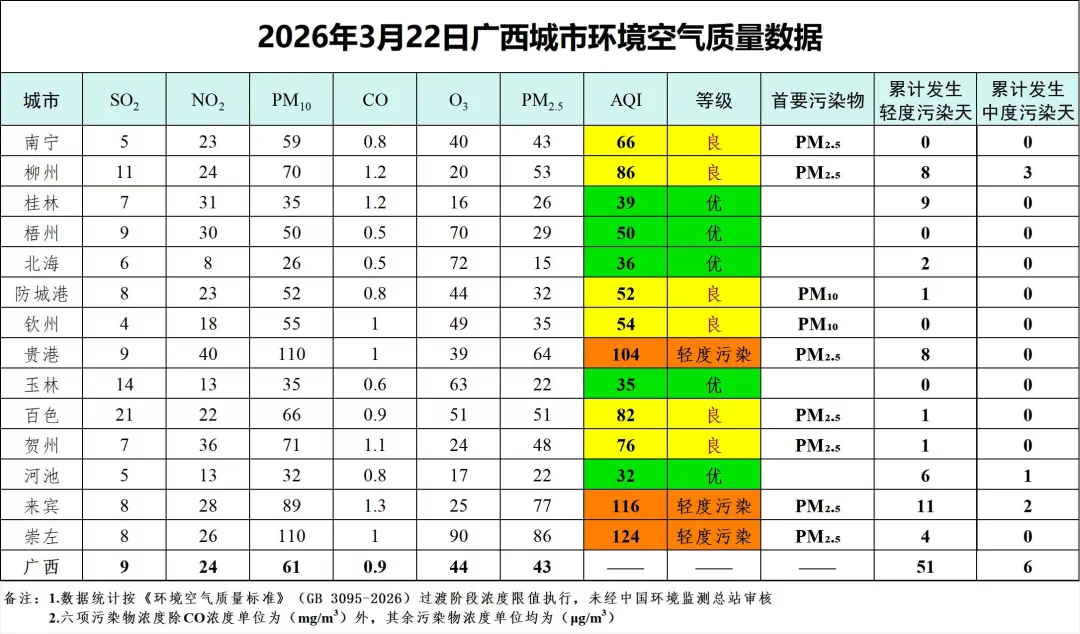 3月22日广西城市环境空气质量数据