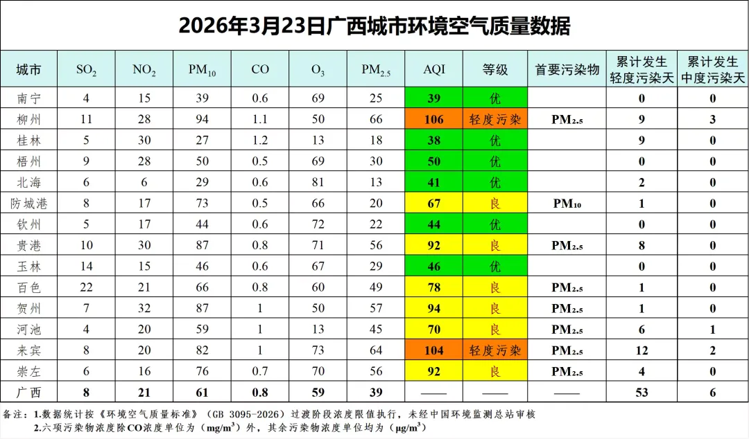 3月23日广西城市环境空气质量数据