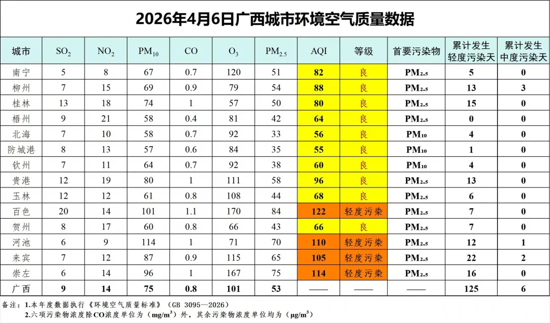 4月6日广西城市环境空气质量数据