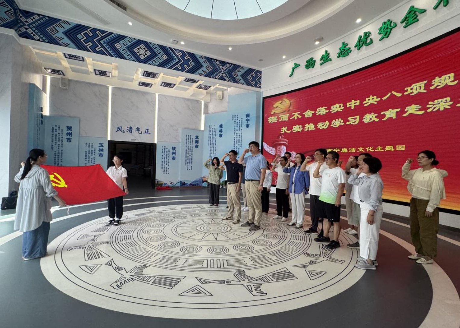 各位党员有序参观了南宁市青秀山廉洁文化主题园,园内设置的首届中央监察委员会名人雕塑、咏竹诗词石刻墙绘等将廉洁文化与山水园林有机融合,大家在廉洁文化宣传的“小阵地”中潜移默化地感受全面从严治党的“大要求”,以“润物细无声”的方式进一步筑牢拒腐防变思想防线。此外在主题园内重温了入党誓词,在“风清气正”和“山清水秀”的生态长廊里感受如生物多样性保护、山水林田湖草沙一体化保护、竹子的古今文化碰撞等等广西独特的生态文化名片。