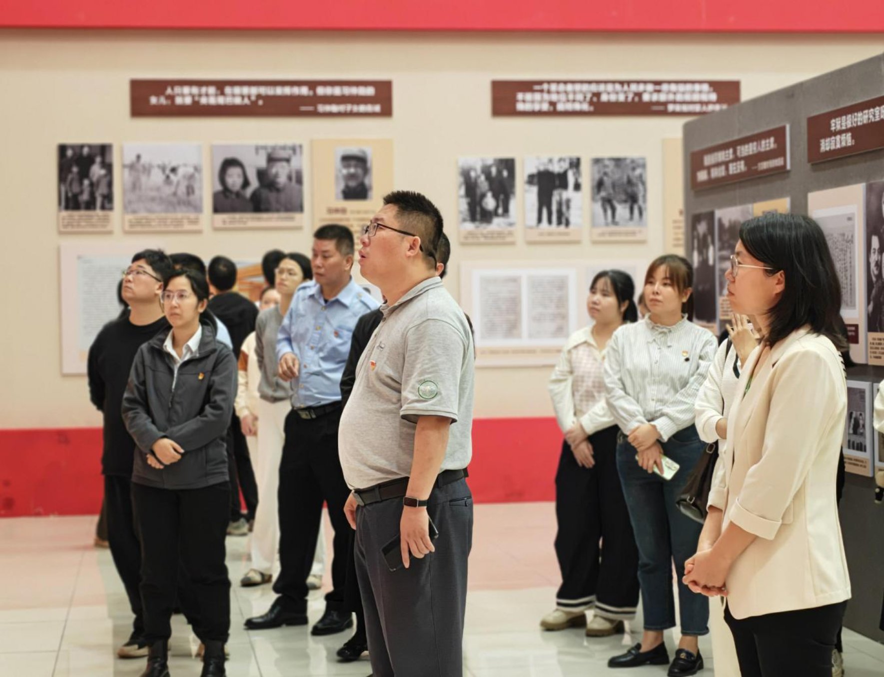 党员干部职工认真聆听讲解、驻足观看展品