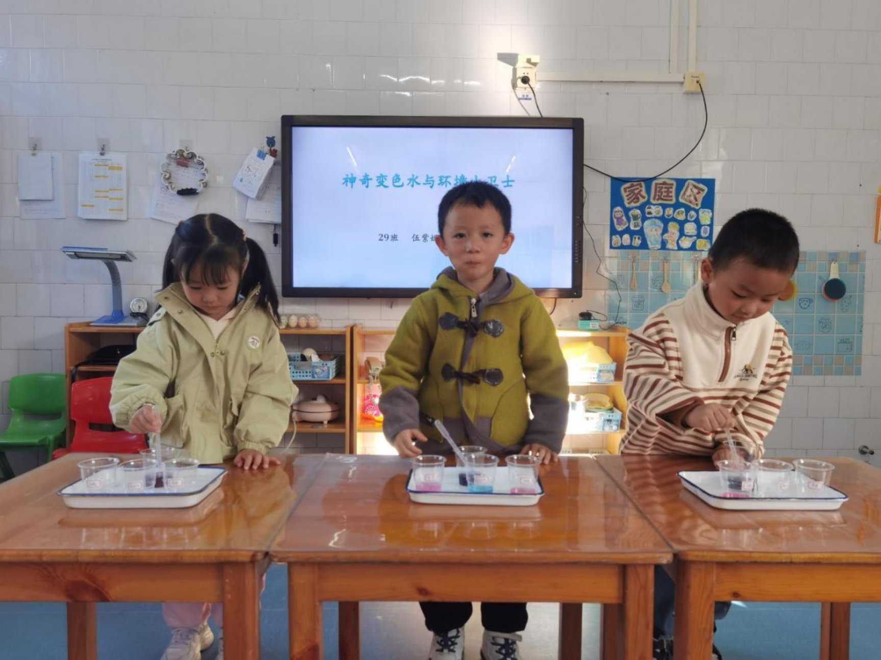 课堂上,农美珍用生动浅显的语言,向小朋友们介绍了保护环境特别是保护水资源的重要性。随后,在幼儿园老师的协助下,孩子们化身“环境小卫士”,亲自动手,将紫甘蓝水滴入白醋、小苏打水和雪碧等不同的液体中,观察并惊呼于杯中液体颜色的瞬间变幻。从紫甘蓝水的紫色,到遇到酸性液体变成红色,再到遇到碱性物质变成绿色或蓝色,色彩的神奇变化让孩子们直观地感受到了生活中物质酸碱性的不同,初步理解了环境监测中“指示剂”的作用,仿佛亲手操作了一场简易的“环境检测”。