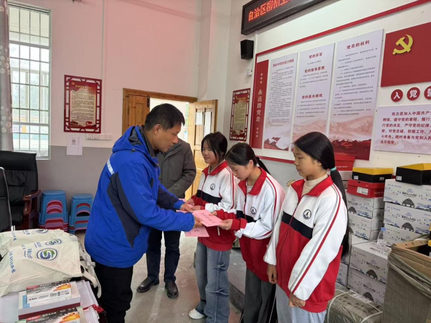 柳州中心党员干部首先来到三江县富禄乡中学。在简朴而温暖的资助活动中,工作队员将助学金与学习用品交到3名侗族、苗族学生手中,并关心地询问她们的学习和生活情况。这已是柳州中心连续第19年在此开展捐资助学活动,累计资助学生50余人。“我会记住这份鼓励,用更好的成绩回报家乡。”受助学生小贾真挚的话语,让工作队员脸上都露出了温暖的笑容。尤为可贵的是,从校长口中得知,已有早期受助学生顺利完成学业,考取公务员后回到家乡,正以实际行动建设侗乡。这项持续多年的工作,不仅在物质上给予支持,更通过长情的陪伴与关怀,在青少年心中深植了感恩与奋斗的信念,以教育的绵长之力,促进了深厚的情感交融与团结共识。