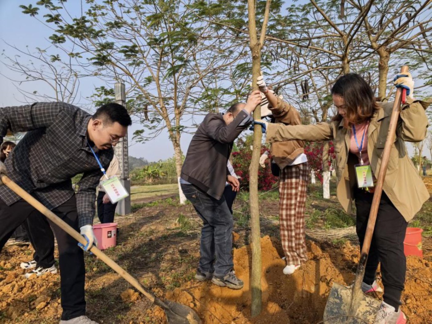 植树造林播新绿,同心共筑团结林。活动现场干部职工们分工协作、默契配合,挥锹铲土、扶苗定植、培土压实、提水浇灌,每一道工序都认真细致、规范有序。不同民族、不同岗位的职工在并肩劳作中分享植树技巧,在汗水挥洒中增进情谊,让“手足相亲、守望相助”的理念融入一棵棵桂花、木棉花、玉兰树的栽植过程。此次植树不仅是践行绿色发展理念的生动实践,更是各族干部职工手足相亲、守望相助的真实写照,每一棵树苗都成为“民族团结+生态环保”的双生苗,为金龙湖公园增添了一抹新绿,更种下了各族干部职工共建美丽家园的同心希望。