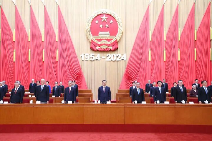 今天,我们隆重集会,庆祝全国人民代表大会成立70周年,回顾中国共产党领导中国人民建立、完善人民代表大会制度的光辉历程,进一步坚定道路自信、理论自信、制度自信、文化自信,在新时代新征程坚持好、完善好、运行好人民代表大会制度,努力开创中国式现代化建设新局面。