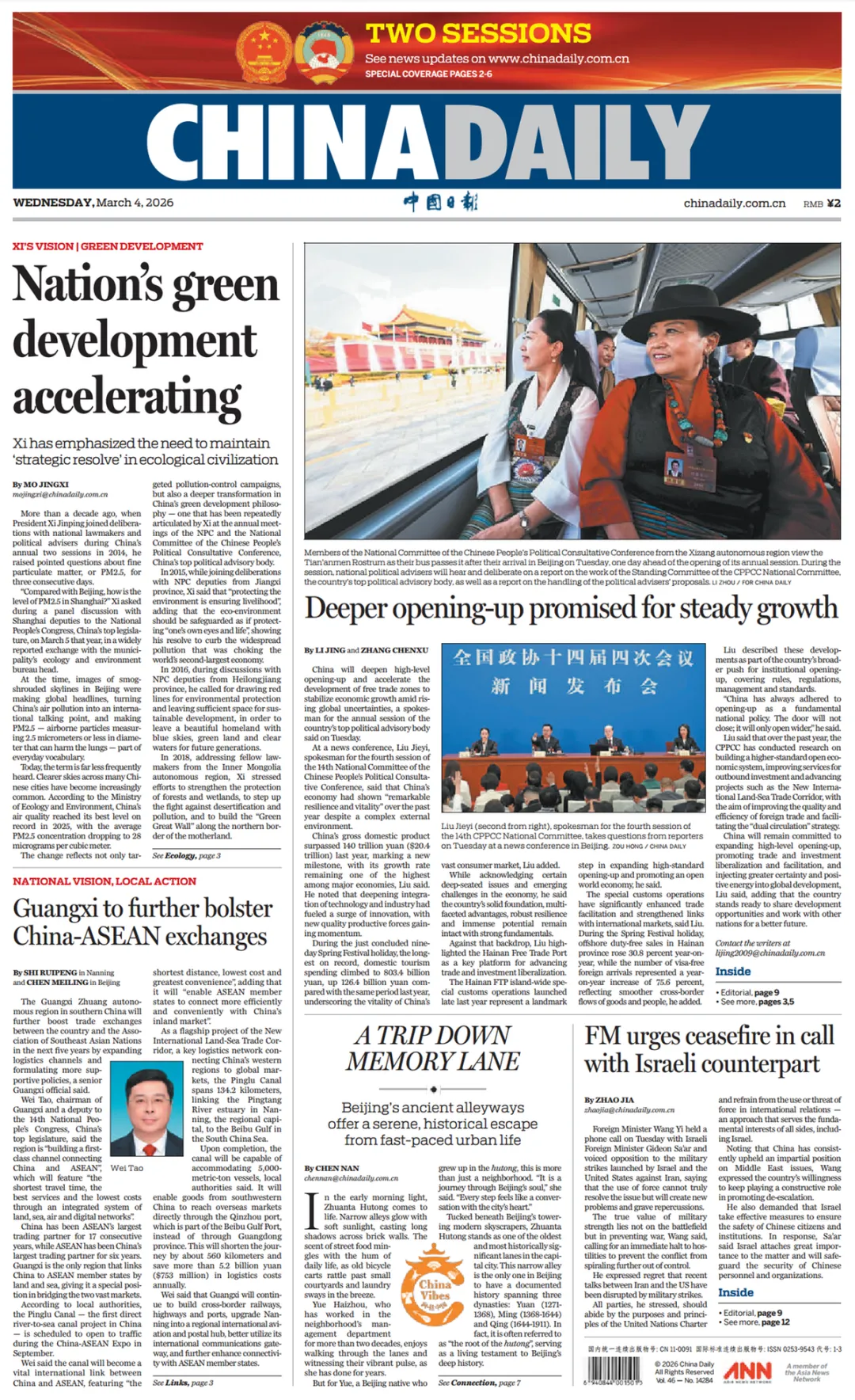 3月4日,《中国日报》头版刊发专访文章《充分发挥面向东盟开放合作的前沿和窗口作用 更好服从服务于构建中国—东盟命运共同体》(Guangxi to further bolster China-ASEAN exchanges)。