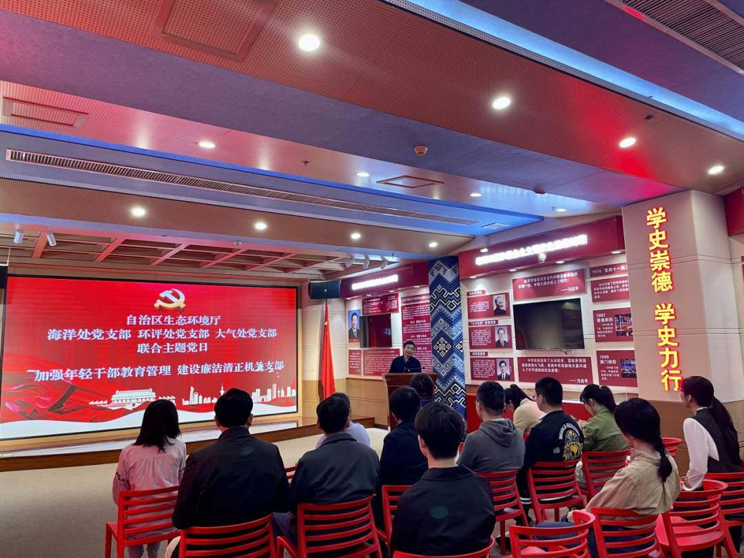 参观活动后,在自治区生态环境厅党史学习教育馆上了题为“加强年轻干部教育管理 建设廉洁清正机关支部”的党课。一是再传达再学习关于年轻干部的教育管理相关文件,学习了《习近平在十九届中央纪委六次全会上发表重要讲话强调坚持严的主基调不动摇 坚持不懈把全面从严治党向纵深推进》和《中共中央办公厅关于加强年轻干部教育管理监督的意见》。二是以案为鉴、以案明纪,进行案例剖析及警示讲解。李亮光同志结合自身工作经历,在长时间跨度上选择了过往案例和近期案例进行剖析,教育年轻干部树立正确的权力观,当好群众服务员,注重培养党性,不断锻造自己。韦卫华同志从空间跨度选取了不同部门的4个年轻干部违法违纪案例,总结了4个方面经验,警示年轻干部坚定理想信念、严守法纪法规、扣好廉洁从政的“第一粒扣子”。