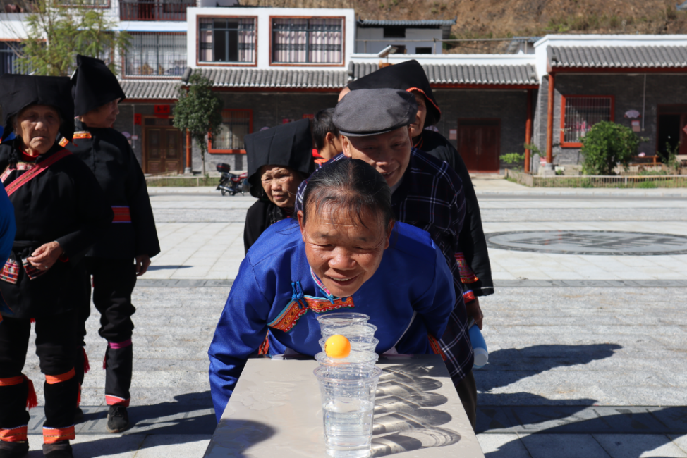 村民进行吹乒乓球比拼