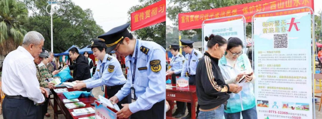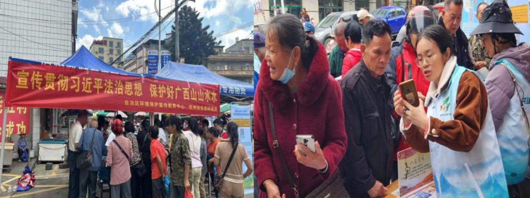 宣传“进乡镇”。在钦州市旧州镇、崇左市江州区江州镇和濑湍镇、梧州市苍梧县六堡镇、来宾市兴宾区凤凰镇、河池市宜州区怀远镇和金城江区东江镇,宣传人员向集市群众发放倡议书和环保宣传手册,引导扫码观看并转发《跟小山小水一起,向秸秆露天焚烧说不!》《跟小山小水一起,向非法转移倾倒处置危险废物说不!》等科普短视频,引导广大群众树牢环保意识,共建美丽家园。