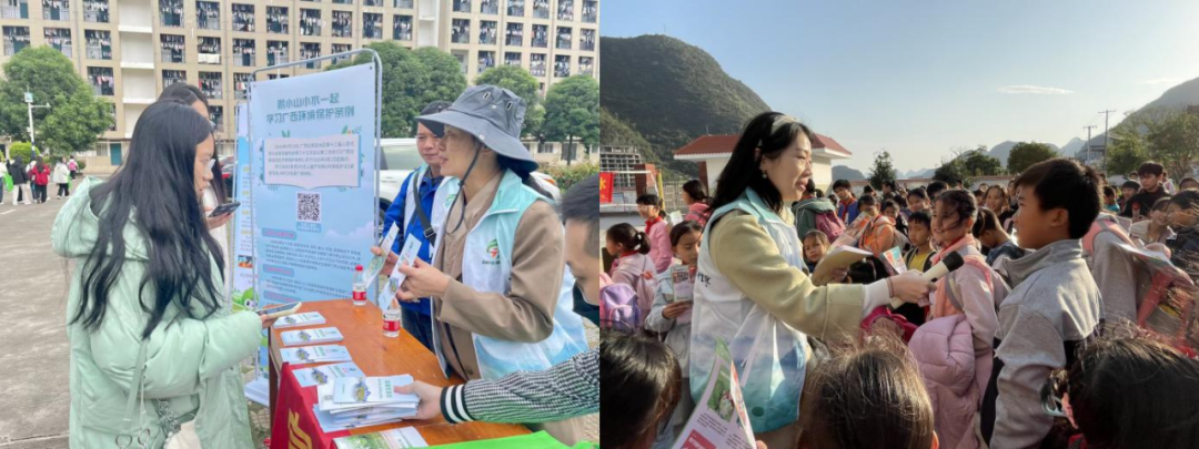 宣传“进学校”。在贺州市黄姚杨村小学、贵港市港北区木兰河小学、来宾市培文学校、东兴市京族学校、广西工业职业技术学院、玉林师范学院,宣传人员根据学生年龄阶段,制定“生态课堂”等差异化宣传教育模式,将生态文明理念与课堂教育有机融合,引导青少年牢固树立生态文明价值理念,提升环境保护意识和社会责任感,以小手拉大手、学生带动家庭、家庭带动社会的方式,将绿色低碳环保生活理念传导到每一个家庭。