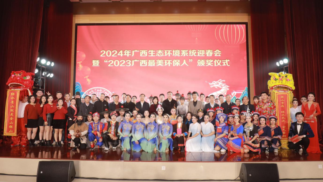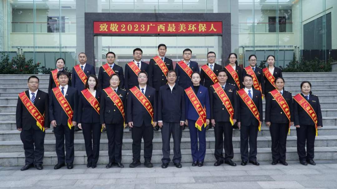在全场热烈的掌声中,陈亮、朱矛量等领导共同为“2023年广西最美环保人”颁发荣誉证书,并与他们合影留念。