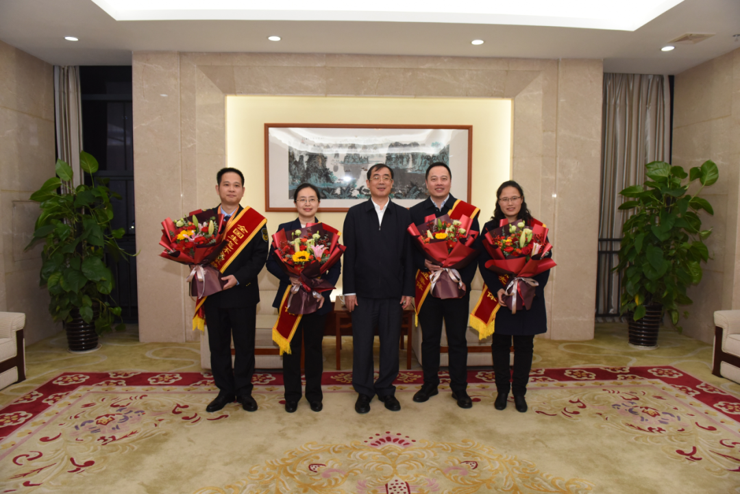 自治区生态环境厅陈亮厅长与获得表彰的先进集体和先进工作者合影。(左二为先进集体代表桂林生态环境局水生态环境科科长汪娟)