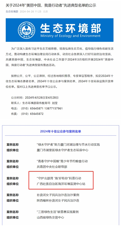 日前,生态环境部、中央社会工作部组织开展了2024年“美丽中国,我是行动者”先进典型宣传推选活动,由广西海洋环境监测中心站组织的“守护北部湾 ‘海’好有你”科普行动入选了2024年“美丽中国,我是行动者”十佳公众参与案例。