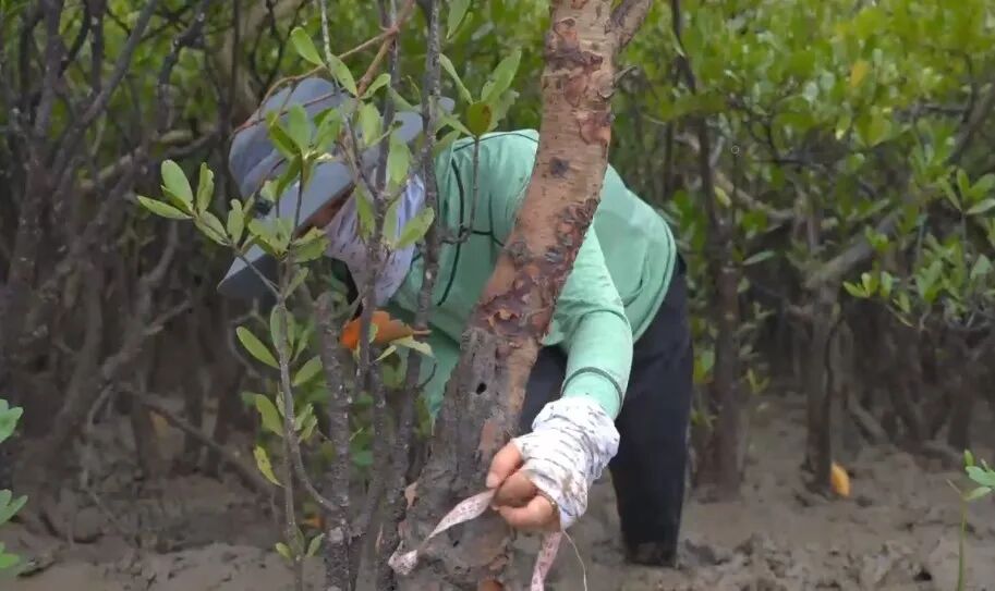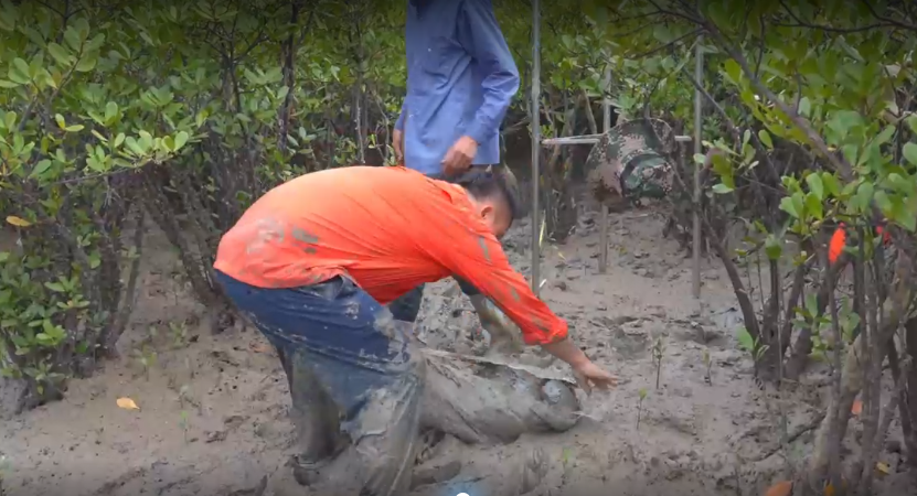 “树高1.2”“胸径2.4”,红树林里传来此起彼伏的声音。“监测中,我们要确定红树的树种,测量树的株高和胸径,以及幼苗的数量等。”骆鑫介绍道:“一般而言,监测水质的站位布设在有红树林分布的潮间带或潮下带。生物体质量则是现场采集1—2种经济贝类的样品,带回实验室进行处理分析。大型底栖生物样品则是在红树样方的四角各取1个面积为25cm×25cm、深约30cm的底泥样方,挖取后就近用海水筛洗,现场挑出肉眼可见的大型底栖生物放入样品瓶中,用酒精固定后带回实验室内进行种类鉴定、计数和称重。”