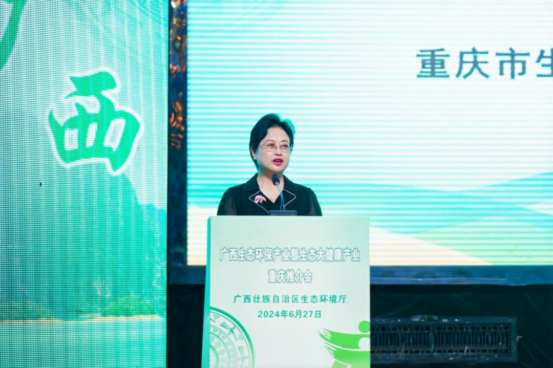 刘芹表示,近年来,重庆市深学笃行习近平生态文明思想,全面贯彻落实习近平总书记对重庆所作重要讲话重要指示批示精神,把“绿色低碳转型发展迈上新台阶”作为美丽重庆建设“五个上台阶”目标之一,深入实施绿色低碳转型行动,充分依托科技创新助力绿色环保产业和生态大健康产业发展,加快打造长江上游制造业绿色低碳发展样板。渝桂两地在地缘、人缘、商缘、文化上相通相连,在区域合作上具有天然条件和优势。今年4月,渝桂双方签署深化战略合作框架协议,共同抢抓新时代西部大开发重大机遇,推动成渝地区双城经济圈与北部湾城市群深化协作,合力建设西部陆海新通道,携手实现互促共赢。本次推介会是进一步推动落实双方战略合作协议的务实举措,我们愿与广西壮族自治区生态环境厅及各有关方面,以此为契机,聚焦美丽中国建设及区域协调发展等战略部署,坚决扛起在长江经济带绿色发展中发挥示范作用的重大使命,有效加强绿色环保产业和生态大健康产业等领域对接合作,共迎新时代西部大开发新机遇、共谋绿色环保产业新发展、共创绿色经济新未来。