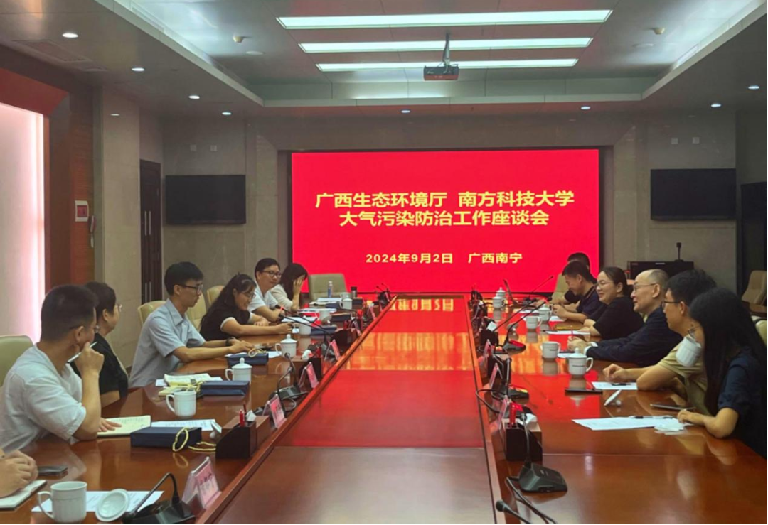 杨新对广西大气污染防治工作取得的成效和空气质量的持续改善表示赞赏,会上介绍了南方科技大学以及环境科学与工程学院的基本情况,傅宗玫教授介绍了大气污染防治领域取得的科研成果,对新时期双方在推动科技成果转化和人才培养等方面的合作表达了热切的期盼。
