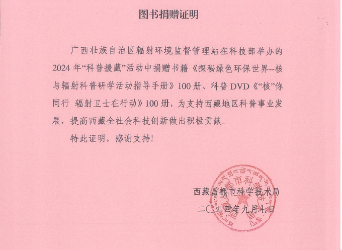 近日,由科技部主办,生态环境部、中国气象局等单位联合举办的2024年“科普援藏”活动在西藏自治区昌都市启动。广西辐射站再次捐赠自主编著出版的科普图书《探秘绿色环保世界——核与辐射科普研究活动指导手册》和科普DVD《“核”你同行 辐射卫士在行动》共计200件,把接地气、惠民生的科普作品送到藏区群众身边,再次让科普之花在雪域高原上竞相绽放。