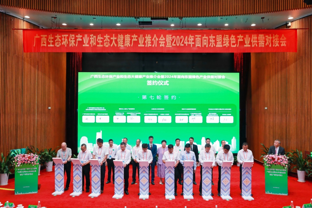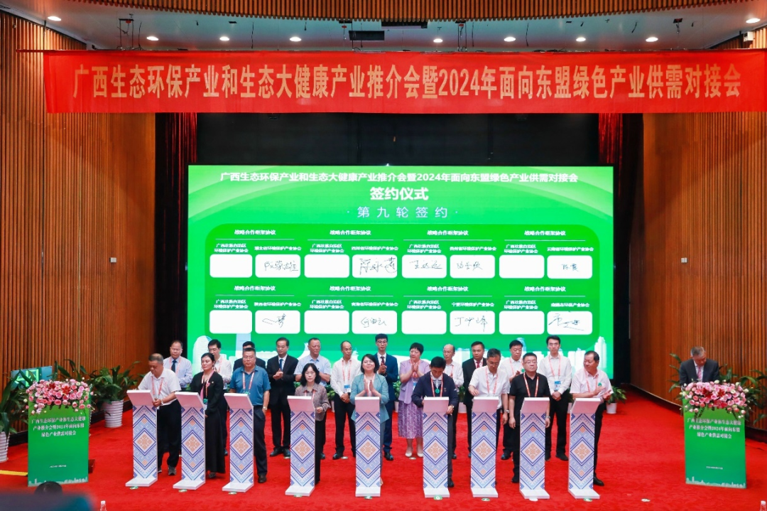 推介会现场,越南、老挝、泰国分别与广西进行现场签约,共签约29个项目、总金额超90亿元;广西环保产业协会与山西、河北等16个省区市环保产业协会签订了战略合作协议。