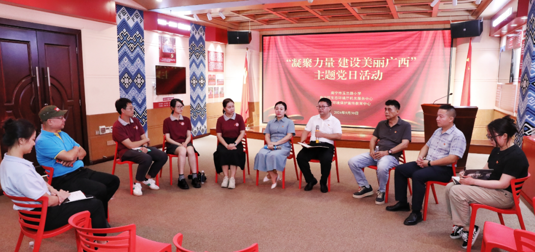 座谈会上,与会党员围绕“凝聚力量 建设美丽广西”主题开展交流讨论,纷纷表示,今年广西出台《美丽广西建设实施方案》,明确了美丽广西建设“三步走”的目标,在未来工作中各支部将依托各自优势,强化交流与合作,共同探讨如何将生态文明教育融入到教育教学工作中,用“绿色教育”推动“绿色发展”,助力学校开展小手拉大手活动,将生态文明种子根植孩子心中。