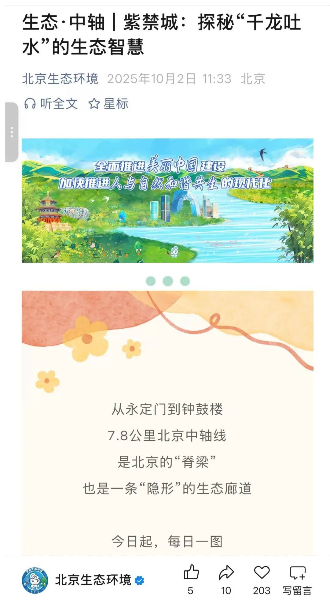国庆中秋长假期间,“北京生态环境”围绕北京中轴线策划“生态・中轴”系列长图,以北京中轴线7.8公里地理跨度为明线,与“隐形生态廊道”相结合,串联起文化遗产保护与生态智慧。特别是以紫禁城“千龙吐水”为纽带,深入介绍了紫禁城排水系统中蕴含的古人生态智慧。“安徽生态环境”以“专属月饼”为创意载体,将环保人坚守、担当、奉献的职业精神化作独特“风味”,既传递了中秋节日祝福,更展示了“生态环保铁军”的形象。“陕西生态环境”以“陪伴式科普”为核心,创新推出“国庆环保七日小课堂”系列内容,通过每日聚焦一个生活场景进行科普,引导公众将绿色理念融入日常。
