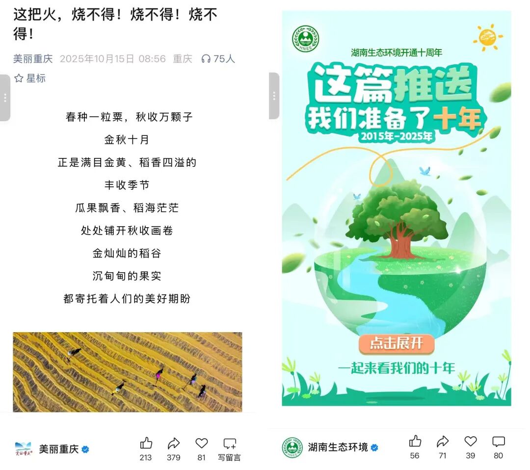 “美丽重庆”文章《这把火,烧不得!烧不得!烧不得!》,标题采用反复强调的感叹句,用强烈的语气传递出核心态度,吸引读者注意力。文章开篇以“金秋丰收”为切入点,用“稻香四溢、稻海茫茫”勾勒出喜悦的丰收图景,再顺势点出“秸秆处理”的现实烦恼,引出“焚烧秸秆”这一核心讨论话题。文章搭配海报将秸秆禁烧的相关知识融入其中,口语化的表达拉近了与公众的距离,让环境宣传摆脱了生硬说教。“湖南生态环境”精心策划双微运营十周年活动,发布推文《十周年耶~活动奖品由你决定!》《这篇推送,我们准备了十年》,通过预热互动,展示运营成果。既借十周年节点强化品牌认知,又通过创新形式和粉丝互动提升传播力。
