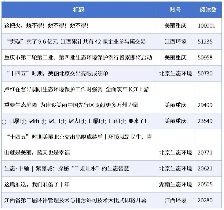 江西、重庆、北京等账号的多篇推文广受关注,内容聚焦各地生态环保工作动态与成果。包括“江西环境”《“卖碳”卖了9.6亿元 江西累计共有42家企业参与碳交易》《江西省第二届环评管理技术与排污许可技术大比武即将开幕》、“美丽重庆”《重庆市第二轮第三批、第四批生态环境保护例行督察即将启动》《卢红在督导调研生态环境保护工作时强调 全面筑牢长江上游重要生态屏障 为建设美丽中国先行区贡献更多万州力量》,以及“北京生态环境”《“十四五”时期,美丽北京交出亮眼成绩单》《环境就是民生,青山就是美丽,蓝天也是幸福》。