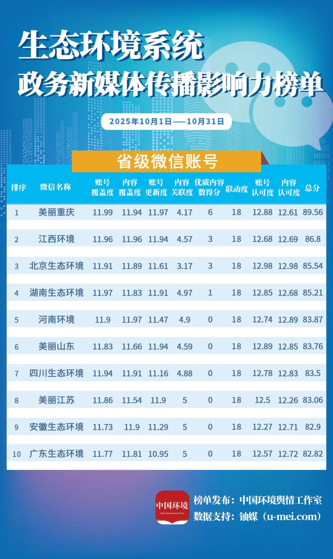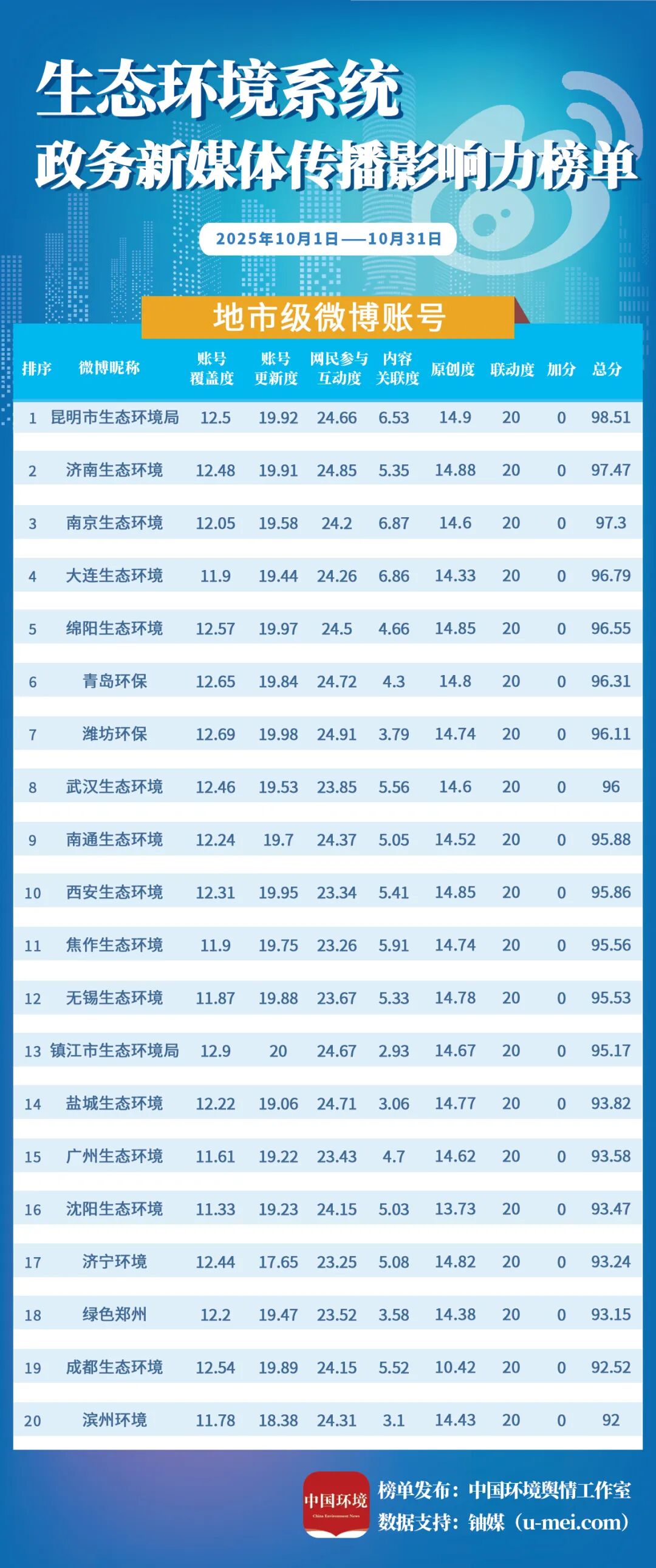 为进一步推动生态环境系统政务新媒体持续健康发展,更好发挥信息公开、舆论引导、社会治理、凝聚共识等作用,中国环境报社、中国环境客户端日前发布10月全国生态环境系统政务新媒体传播影响力榜单。