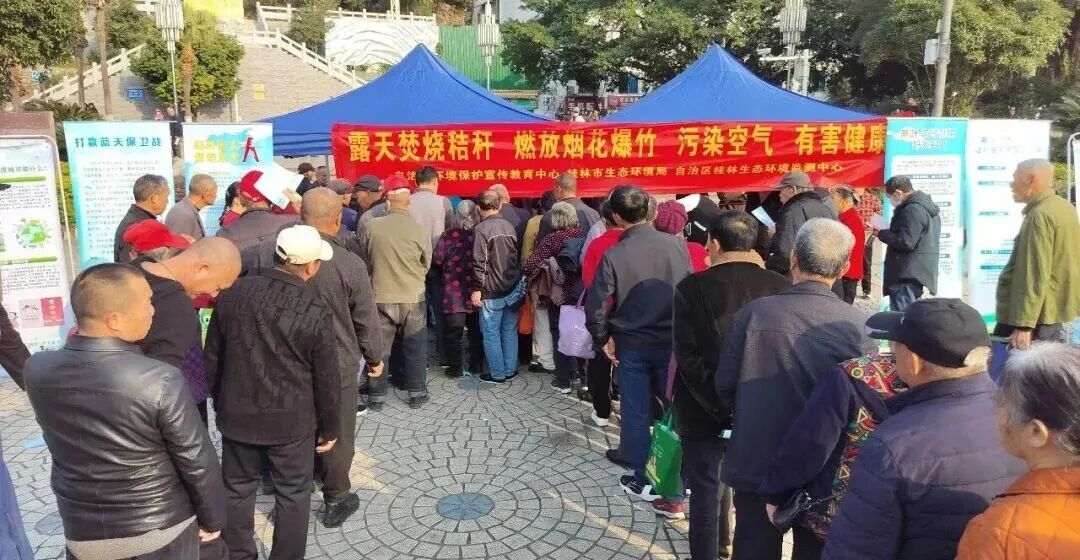 “阿婆,你不会用手机扫码没关系,拿资料回去让家人一起看,了解大气环境保护的知识……”“阿叔,秸秆焚烧会产生呛人的烟雾,污染空气,还可能引发火灾……”“过年放烟花虽热闹,但会产生大量颗粒物和有害气体,让空气变得浑浊,影响呼吸健康,还可能造成噪声污染和安全隐患……”桂林市生态环境局各支部志愿服务队员们用通俗易懂的话语,讲解大气污染的危害、主要来源、防治措施及相关法律法规,阐释露天焚烧秸秆和燃放烟花爆竹对空气质量的破坏作用以及对人体健康的潜在危害,同时深入解读相关管控政策以及违法违规行为的举报途径。自治区桂林生态环境监测中心的技术人员还针对大气污染治理问题进行现场答疑,让群众直观感受桂林大气污染防治工作相关情况。现场互动氛围热烈,活动累计发放宣传材料2000余份,数百名群众观看和分享科普视频,有效提升了公众对大气污染防治工作的知晓率和参与度。