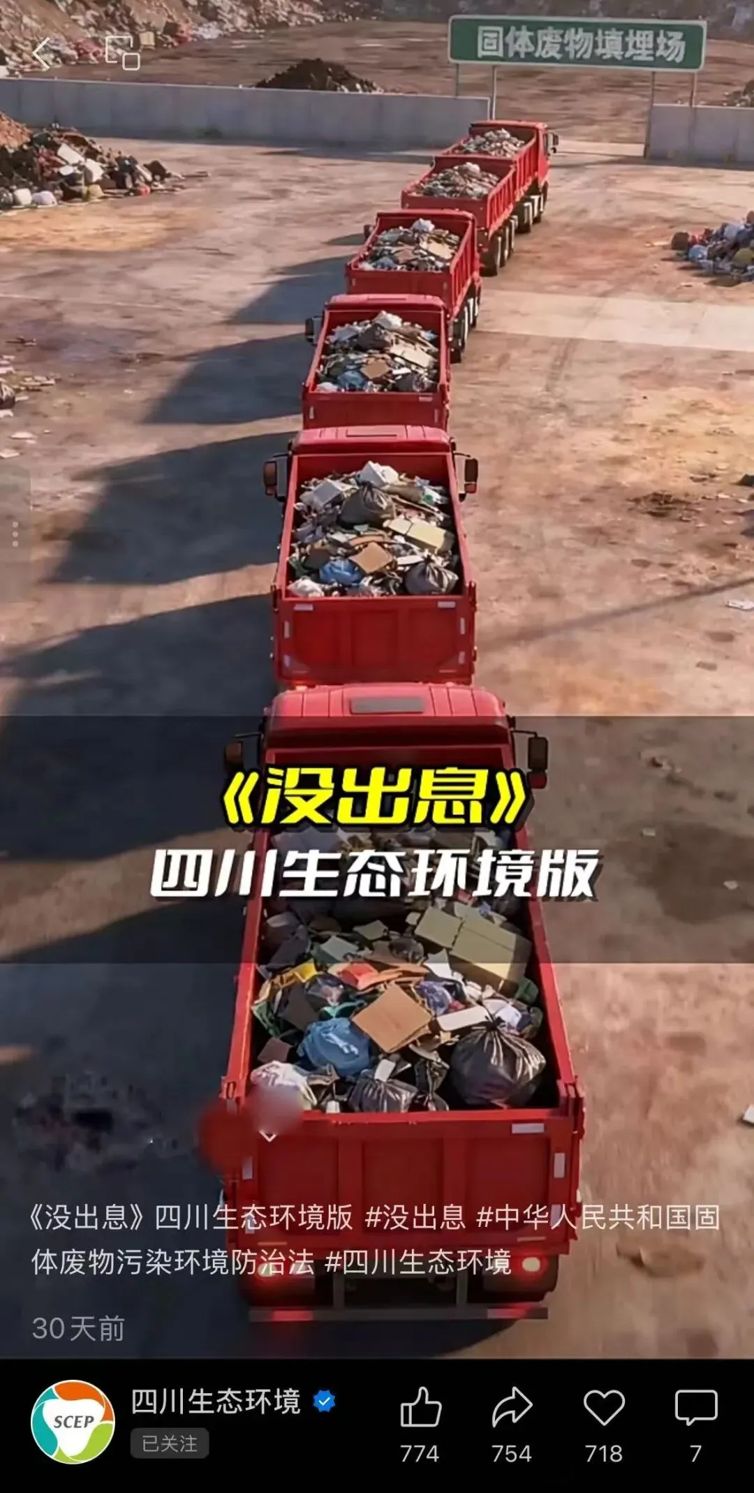 “四川生态环境”推出《没出息》四川生态环境版,巧妙借用《没出息》旋律与叙事结构,生动演绎固体废物运输车辆司机从“‘从容不迫’违法”到“‘连滚带爬’被查处”的戏剧化过程,阅读量破10万。