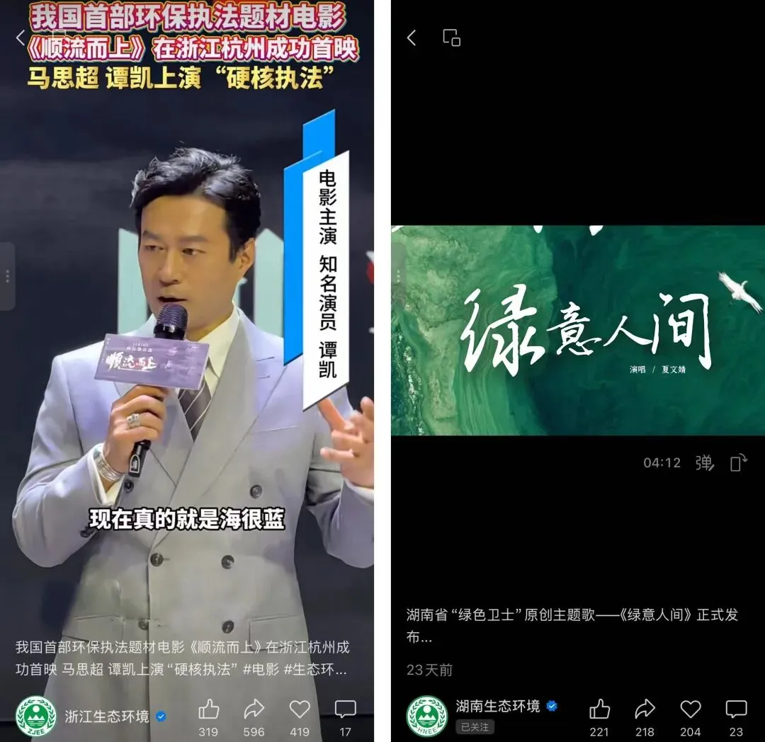 “浙江生态环境”抓住我国首部环境执法题材院线电影《顺流而上》全国上映的契机,推出相关宣传视频。视频开篇以演员谭凯视角,分享环境执法者角色的塑造心路历程,以明星的真情实感建立共鸣,最终落脚在“致敬生态环保铁军”的情感号召,实现价值传递。
