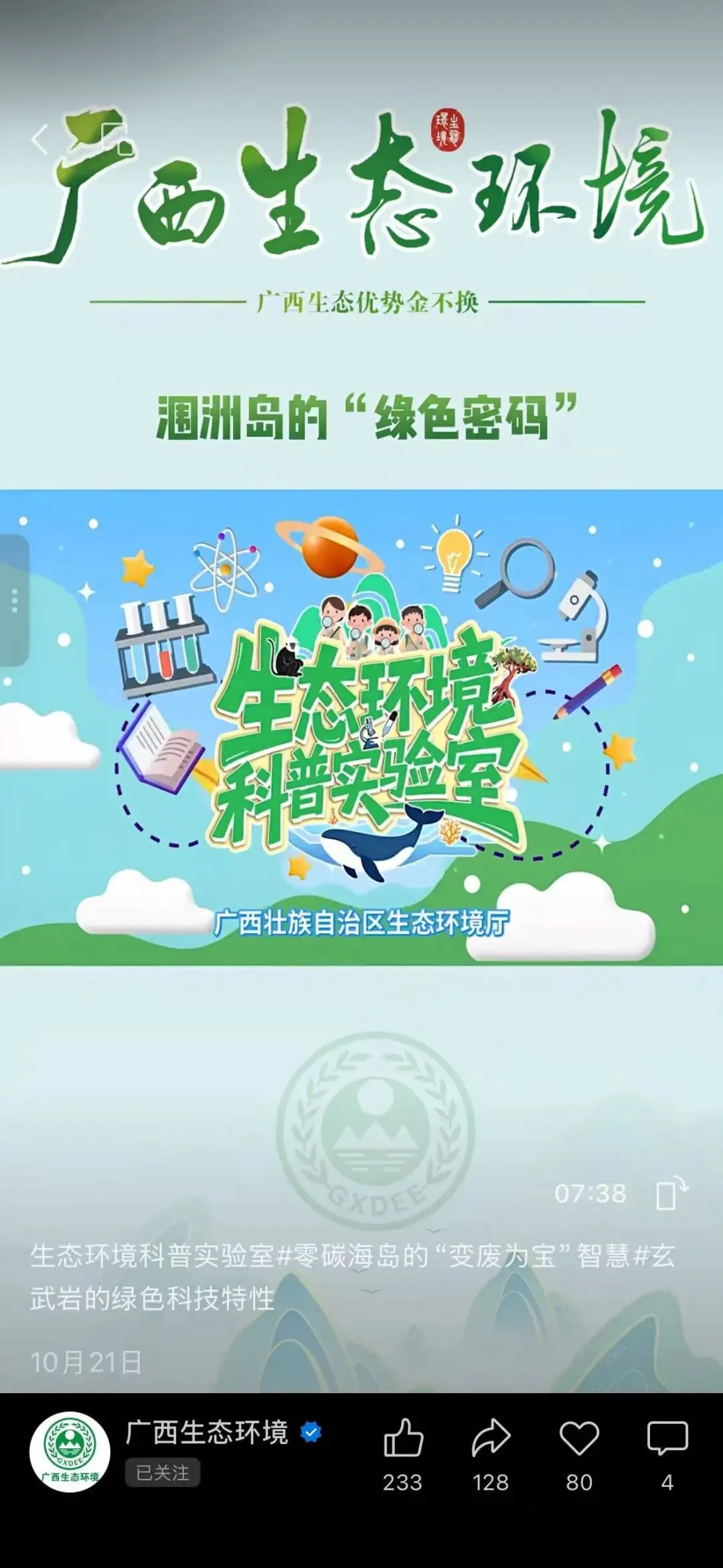 “广西生态环境”推出生态环境科普研学节目《生态环境科普实验室——涠洲岛的“绿色密码”》,聚焦涠洲岛零废弃实践与零碳生活方式,生动呈现涠洲岛生态保护的创新举措与显著成效,让科普内容更具体验感和说服力,阅读量破10万。