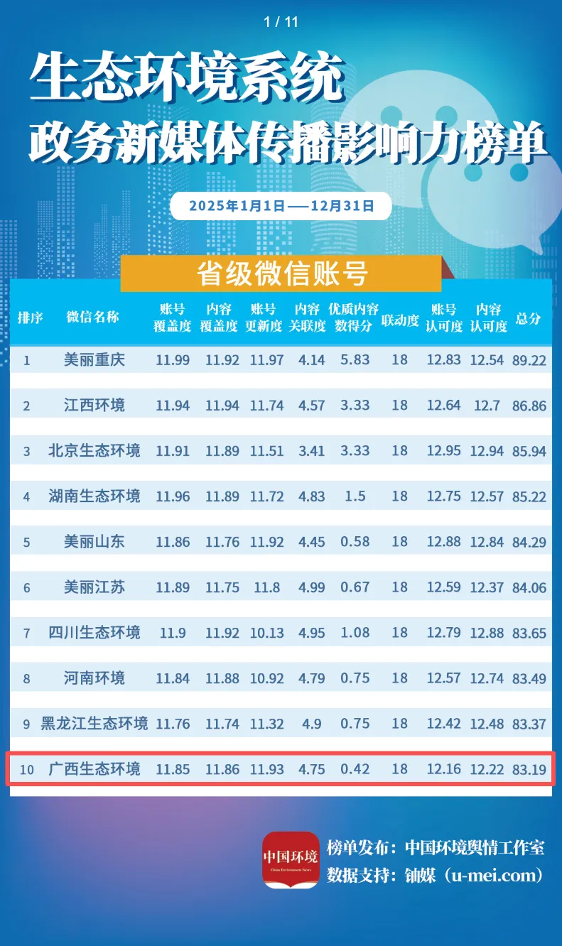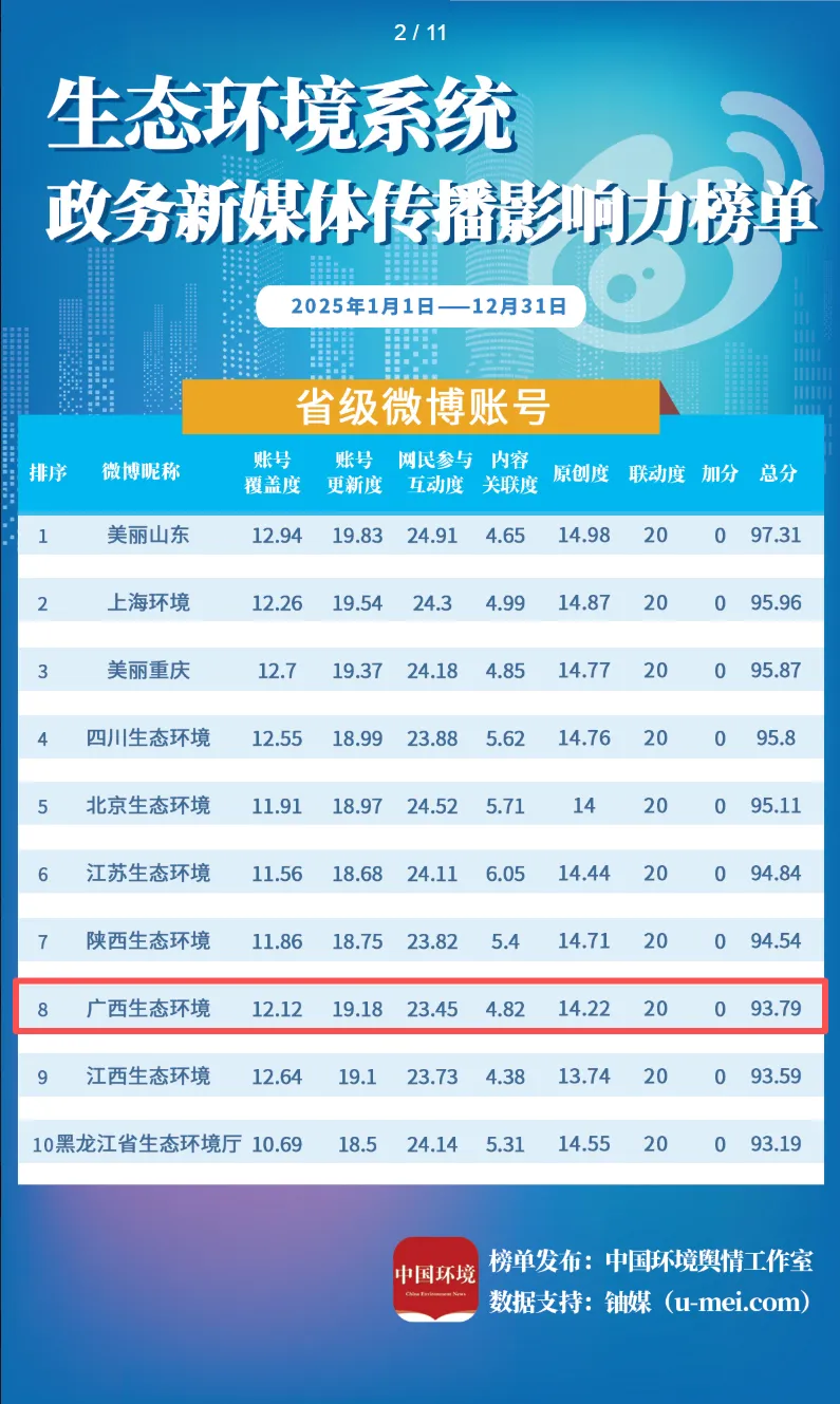 近日,在中国环境报社、中国环境客户端发布的2025年生态环境系统政务新媒体传播影响力年度榜单中,广西生态环境微信公众号、微博账号(以下简称“两微”)双双跻身全国前十,成绩斐然!其中,微信公众号位列全国第10,微博账号位列全国第8。回望2025年,广西生态环境“两微”全国月度排名表现亮眼、稳中有进,微信公众号全年7次跻身全国前十,微博账号9次入围全国前十,长期稳居榜单前列,成为生态环境系统政务新媒体榜单常客。凭借扎实有力的政务宣传与持续精进的内容创新,广西生态环境“两微”收获全网广泛关注,传播力、影响力持续提升。