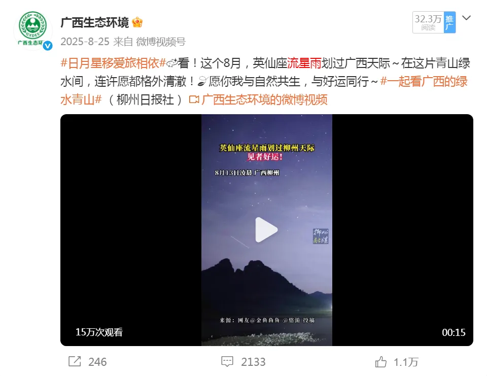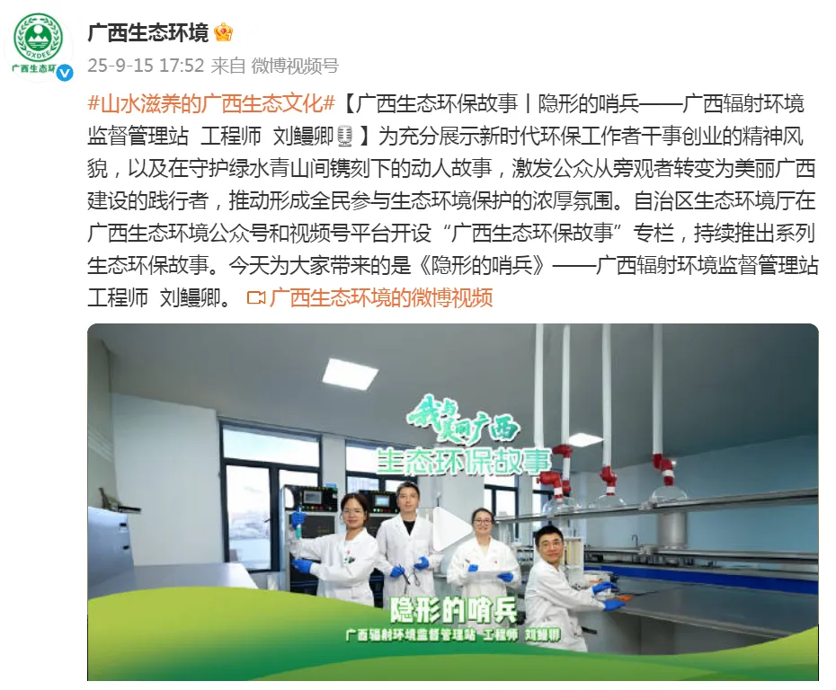 广西生态环境微博立足轻量化传播优势,创新开设生态文化专栏,深耕八桂生态文化底蕴,聚焦生物多样性保护、生态美景、绿色生活、环保文创等特色内容,用鲜活表达、互动话题打造生态文化传播新窗口;兼顾权威信息转发与亲民化互动,将政务传播与文化浸润深度融合,让生态文明理念更接地气、更入人心,形成独具广西特色的传播风格。