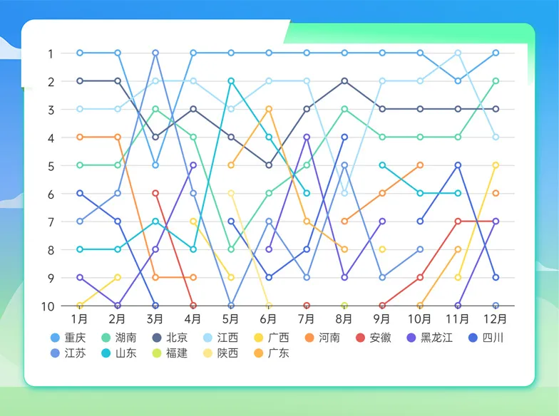 梳理2025年度生态环境政务微信排名情况,有14个省份曾跻身微信榜单前十,其中重庆有10次占据榜首,江西、北京表现稳健,位列第一梯队。湖南凭借自身的特色与优势,始终稳稳处于前十名的行列,河南、四川、山东、江苏、黑龙江、广西等省市排名虽有波动,也是榜单的常客。
