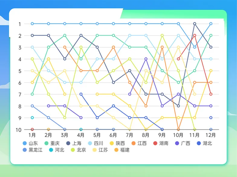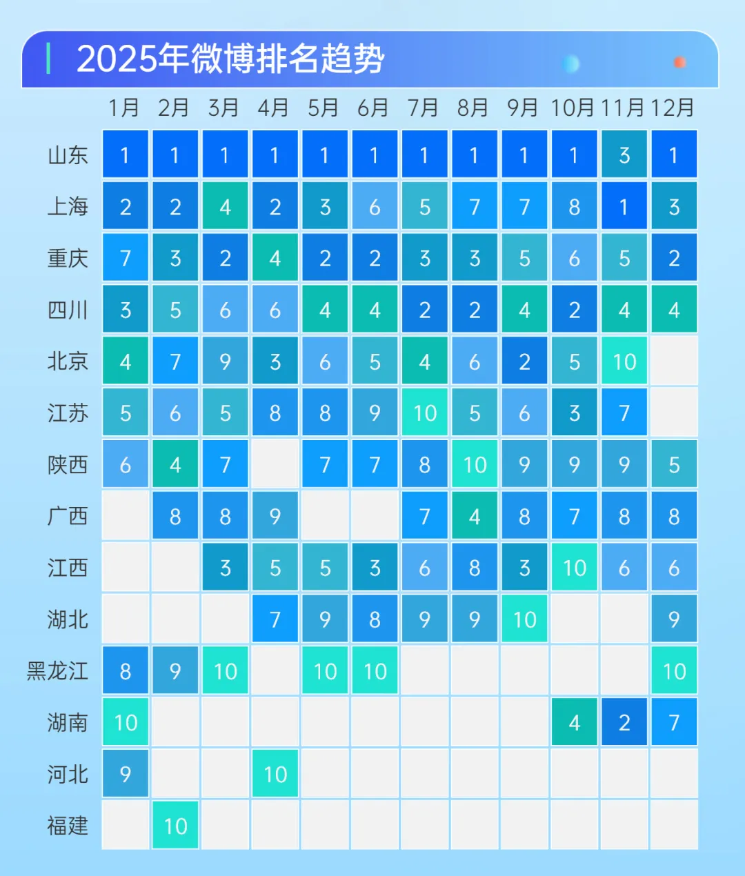 梳理2025年度生态环境政务微博排名情况,有14个省份曾位列前十。山东除11月之外,全年稳居榜首,体现出账号持续的影响力。上海、重庆、四川等省份凭借出色的政务宣传工作收获广泛关注,其中上海在11月成功登顶。北京、江苏、陕西、广西、江西名次虽有波动,但表现较为稳健。