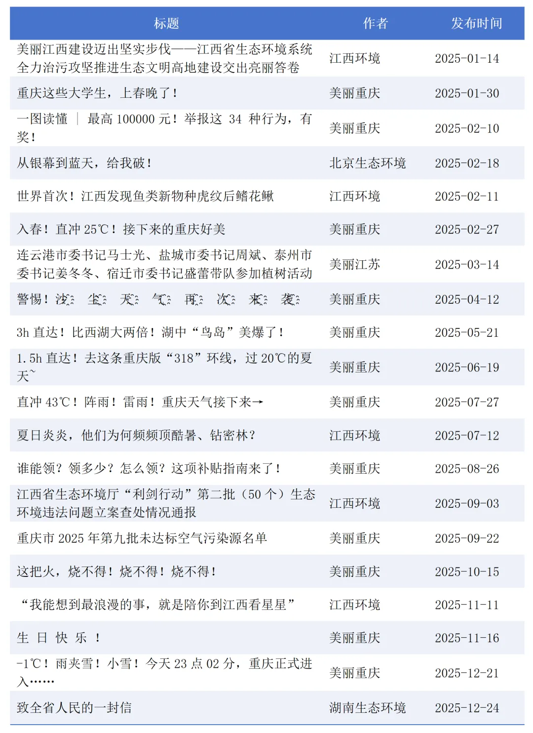 统计发现,2025年全国生态环境系统微信矩阵共有高阅读量(阅读量超过2万+)文章273条,其中省级206条、地市级 67条。全年共有20条微信文章阅读量超过10w+,其中重庆数量最多,江西位列第二,北京、江苏、湖南也均有内容成功破圈。