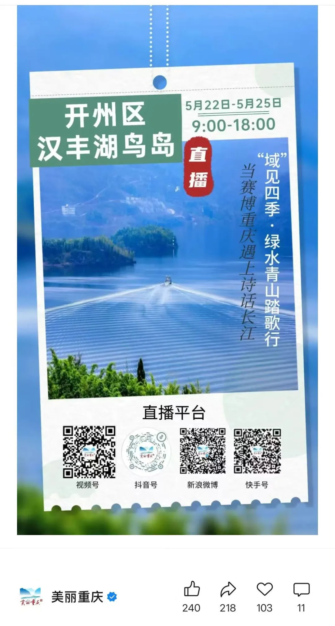 当生态环境宣传与文旅相遇,重庆给出了亮眼答卷。5月22日国际生物多样性日,重庆在汉丰湖开启《“域”见四季:绿水青山踏歌行》直播活动,让湖域生态之美透过镜头触达大众。作为本次直播的预热推文,《3h直达!比西湖大两倍!湖中“鸟岛” 美爆了!》立足汉丰湖国家级美丽河湖优秀案例的定位,在宣传其独特生态资源、宜人生态本底的同时,融合旅游体验,让观众沉浸式感受生物多样性之美,也为美丽重庆打造了鲜明的传播记忆点。推文还同步附上自驾路线、观鸟贴士等实用信息,把宣传内容转化为公众“即刻可出发”的出行指南。