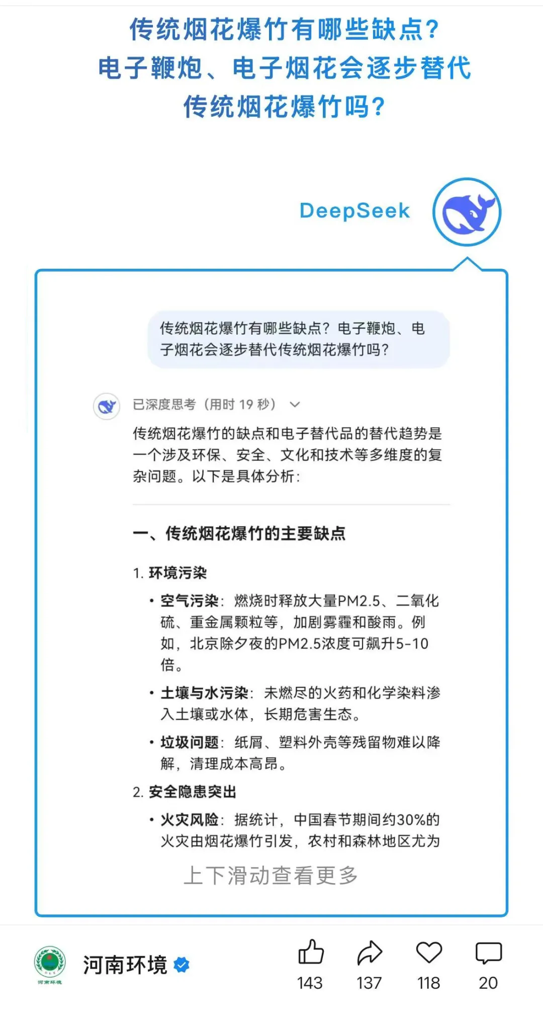 在技术奔流向前的时代,河南与AI对了一次话。河南推文《对话顶流AI,DeepSeek为这个问题指出了一条新路径!》,围绕烟花爆竹话题,由AI分析解答“河南发展电子鞭炮产业是否赚钱”“政府该如何发力”等问题。这种“对话AI”的呈现形式在解读产业发展的同时,也点明了传统烟花爆竹燃放的弊端,让绿色发展理念更易被受众接受。