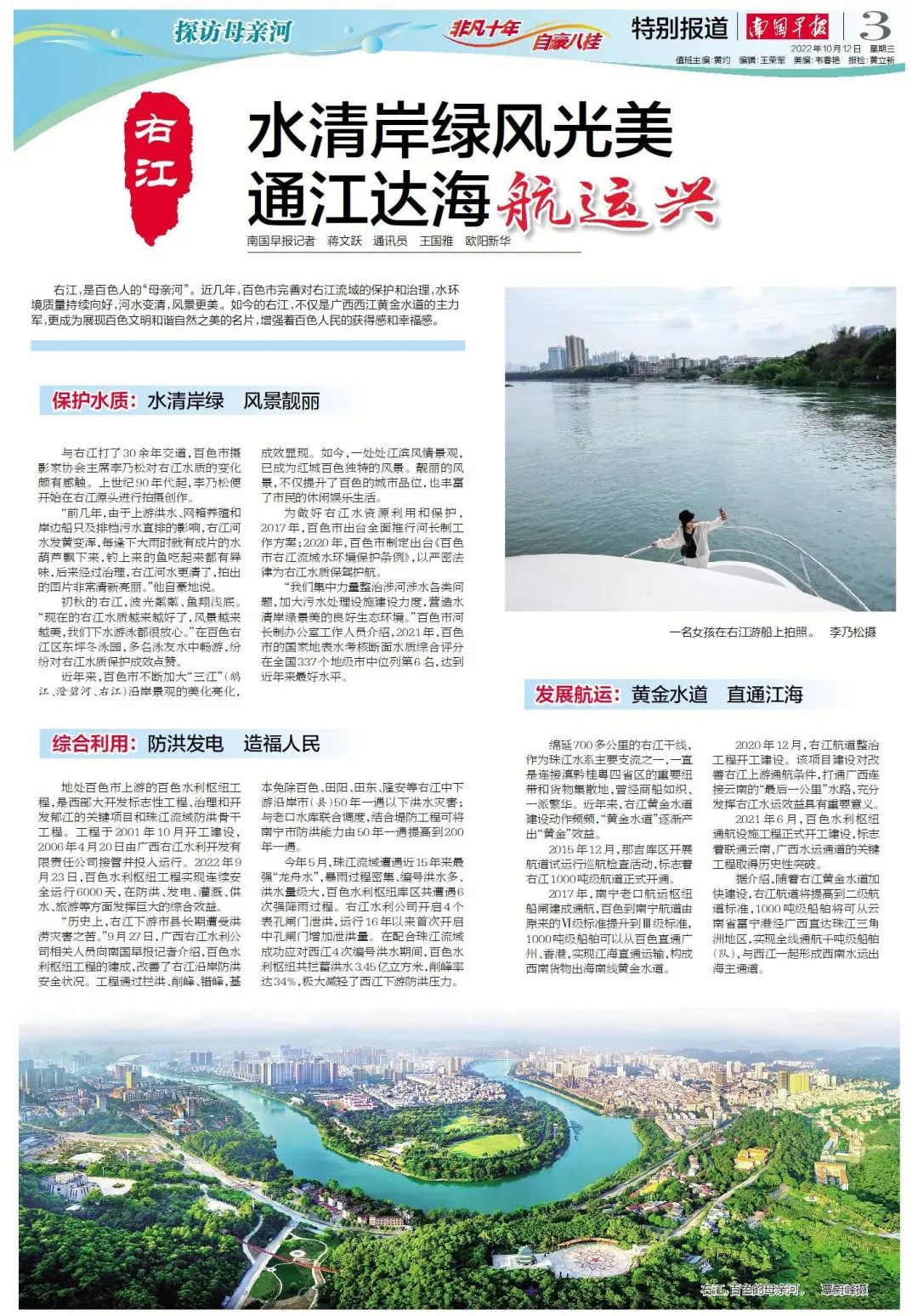 右江,是百色人的“母亲河”。近几年,百色市完善对右江流域的保护和治理,水环境质量持续向好,河水变清,风景更美。如今的右江,不仅是广西西江黄金水道的主力军,更成为展现百色文明和谐自然之美的名片,增强着百色人民的获得感和幸福感。