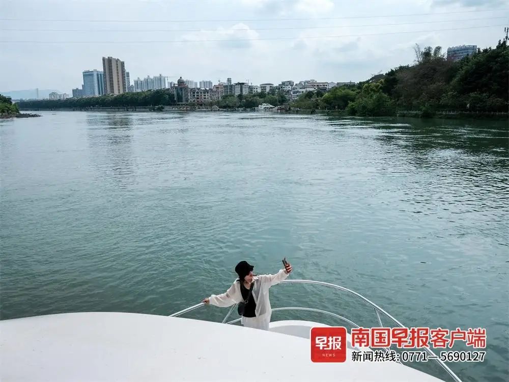 一名女孩在右江游船上拍照。李乃松摄