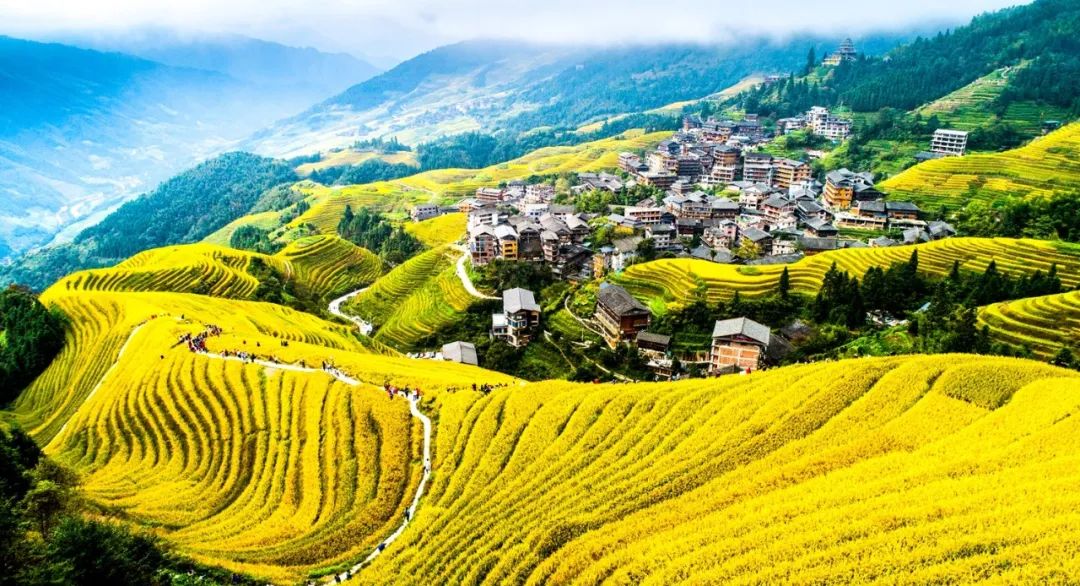 每年十月,龙胜金坑大寨龙脊梯田稻谷成熟,金色的稻田层层叠叠,放眼望去犹如“大地流金”,蔚为壮观,吸引大量中外游客慕名而来。