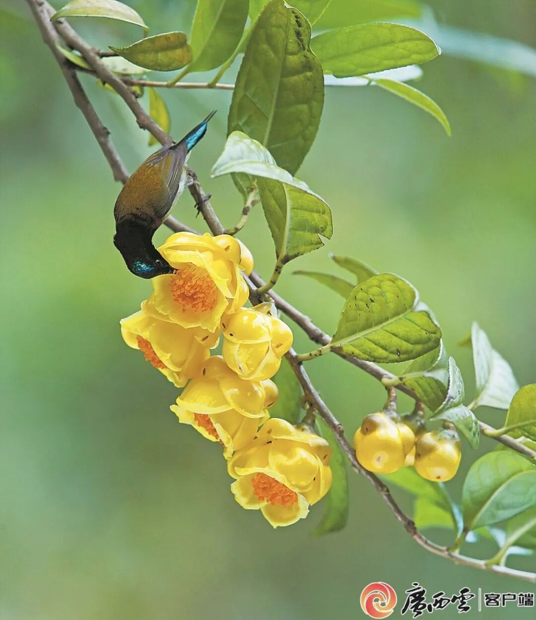 1960年,现代植物学家在广西首次发现金黄色山茶花。其坐果率低、难以繁育、极为稀有,但内含400多种营养物质,药用价值极高,而且在山茶家族中是唯一拥有金黄色花瓣的品种,因此被冠以“茶族皇后”之美誉。