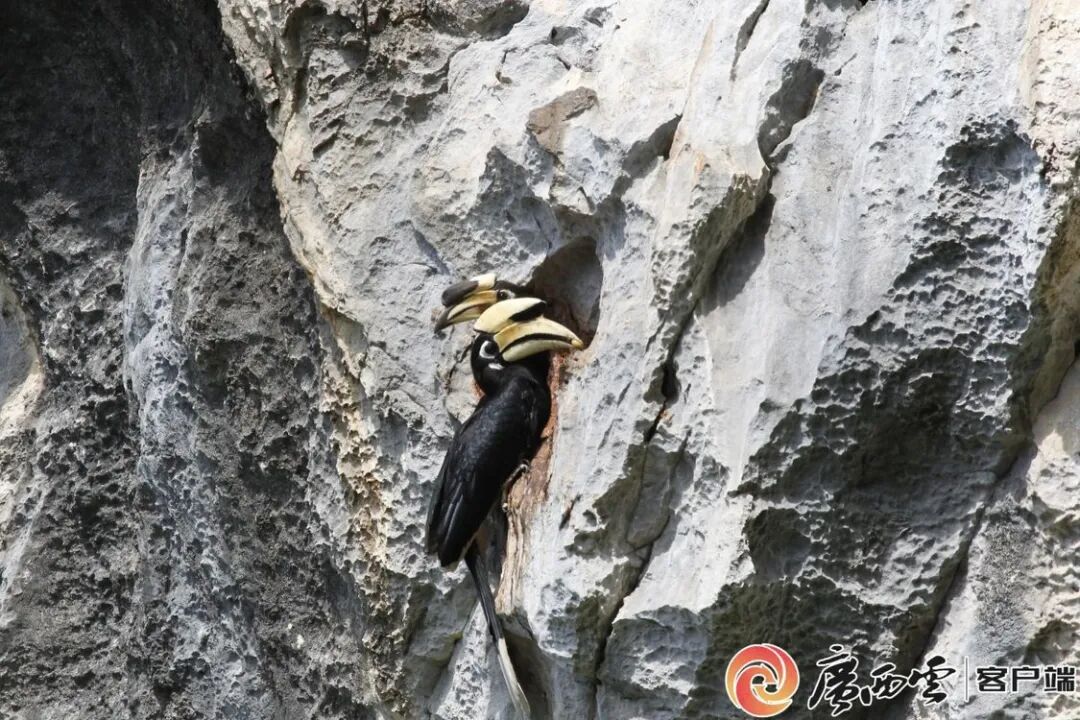 2019年3月,韦忠新带队例行巡山时,巧遇一对大嘴鸟在崖壁石洞筑巢。“冠斑犀鸟一般是在高大乔木树洞中筑巢繁殖,选择喀斯特崖壁石洞,这是在保护区首次发现,此前国内也不曾有过记录。”韦忠新说,刚发现时,不敢确定这对大嘴鸟就是冠斑犀鸟,后经专家鉴定,才得以确认,其独特的育雏方式,引发国内外高度关注。