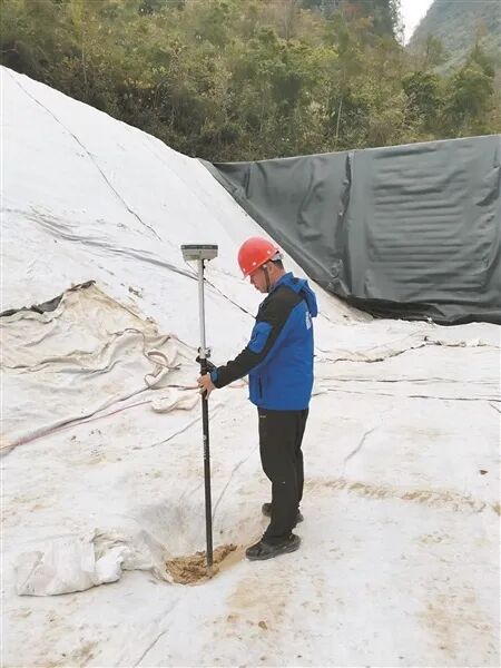 工作人员开展渗压计安装点位测量。河池市生态环境局供图