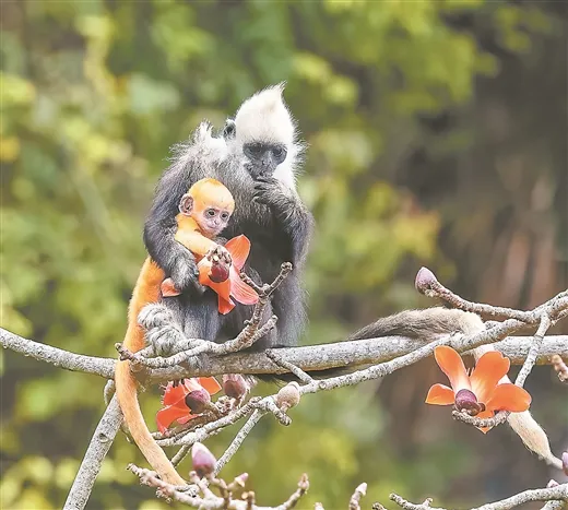 在崇左白头叶猴国家级自然保护区,白头叶猴母子正采食花蜜。吴兆荣/摄